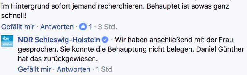 „Nach den Regularien hätte diese SPD-Funktionsträgerin gar nicht im Studio sein dürfen. Dies alleine ist ein grobes Foul der SPD. Es gab eine klare Absprache zwischen NDR, CDU und SPD. Bei der Vorbesprechung war die SPD mit Carsten Maltzan und Raju Sharma hochrangig aus dem engsten Umfeld von Herrn Albig vertreten. Dort sei klargestellt worden, dass die Identität aller Studiogäste überprüft wird, um Funktionsträger der Parteien von der Sendung auszuschließen, damit derartige unfaire Angriffe und Fragen vermieden werden können. Ich kann mir nicht vorstellen, dass dies Herrn Albig nicht mitgeteilt worden ist. Aus mittlerweile gelöschten Beiträgen von ihrem Facebook-Profil und auch der vergleichsweise hohen Funktion wird deutlich, dass Herr Albig diese Dame persönlich kennt. Er hätte derart haltlose Anschuldigungen durch seine Parteifreundin nicht unkommentiert stehen lassen dürfen. Bis jetzt haben sich weder Herr Albig noch Herr Stegner bei der CDU entschuldigt oder distanziert", so Tobias Koch.