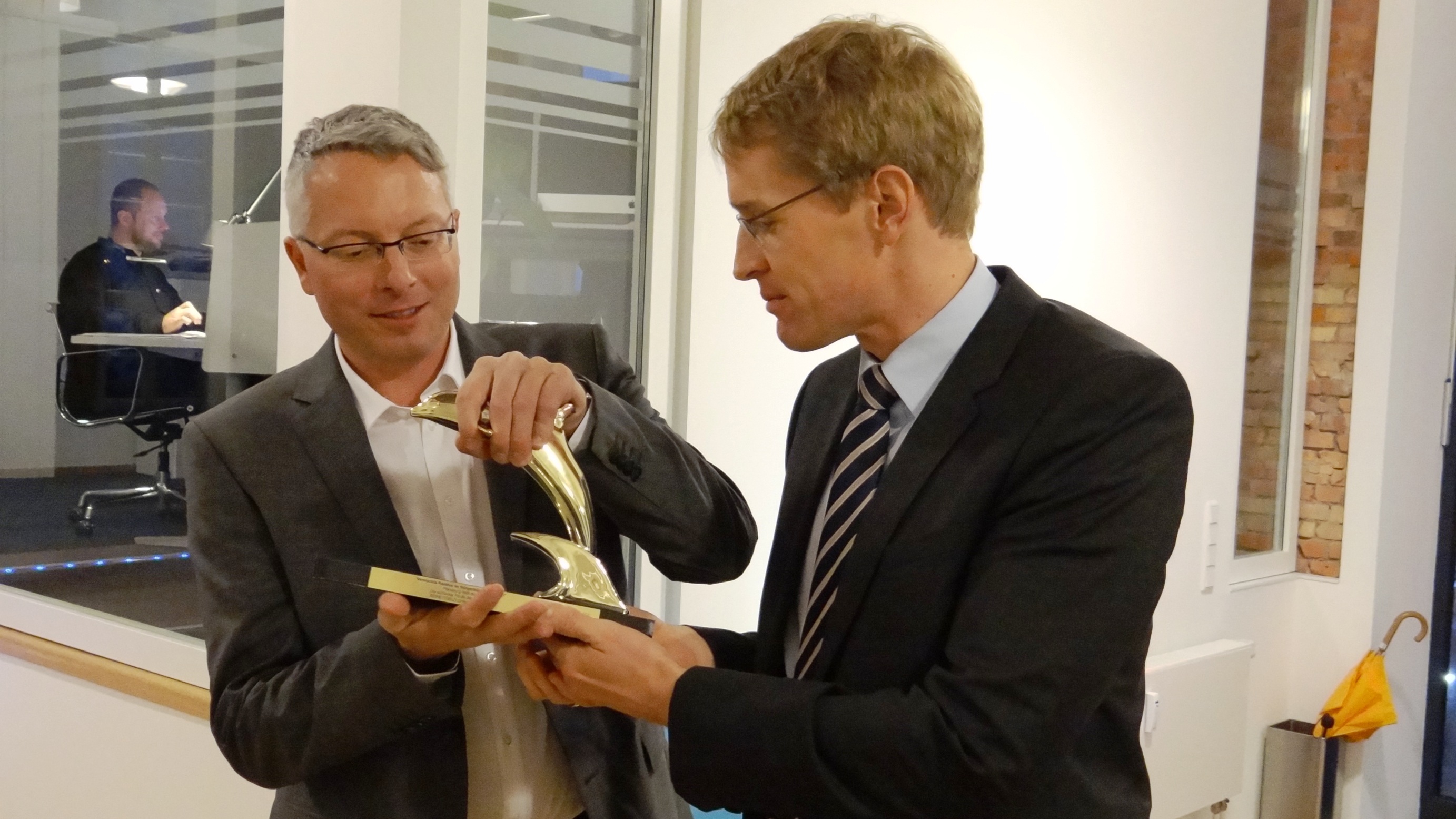 Der Besuch der Kindertagesstätte "kiwi" (siehe gesonderter Beitrag) sowie der Unternehmen bewegtbild und HOCHZWEI an der Fördepromenade machte den Auftakt für einen Besuch des CDU-Fraktionsvorsitzenden im Kieler Landtag, Daniel Günther, MdL. Der Oppositionsführer und nominierte Landesvorsitzende inspizierte bei bewegtbild nicht nur den frisch eingetroffenen goldenen Delphin der Cannes Corporate Media & TV Awards. Die Auszeichnung war in der Kategorie "viraler Hit" an die Flensburger gegangen.
